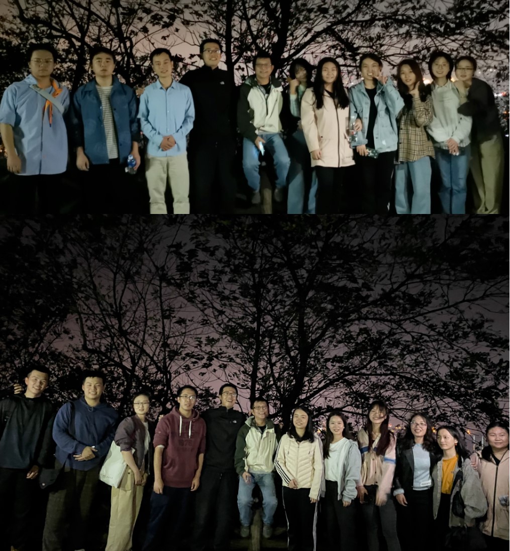 在简单休整后,师生们再次向山顶进发。不断攀高的同时,山路也更为险峻,同学们互相提醒,注意脚下山路。山路碎石嶙峋,大家双手双脚并用以维持平衡,也有同学抓着路旁的树根或是树枝不断前进着。穿过最险峻的一段山路,岳麓山顶的灯光终于出现在众人眼前。在中心师生们的相互帮扶和不懈努力下,一行三十余人全部登顶。