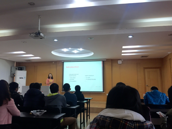 在此次学术研讨会中,李雪老师以2002年调查的中国五个城市成年双胞胎数据集为样本数据,探讨“干部”家庭在收入、教育及政治地位方面对于子女和法律上的子女的动态影响,研究社会地位的代际传递。文章通过大量的数据处理并分析比较,最终发现一个干部可以通过提高教育水平和政治地位帮助他(她)的孩子(尤其是儿子)和法律上的孩子(尤其是女儿)获得高收入工作。此外,研究表明,相比男性,女性更加能够通过婚姻提高社会地位。李雪老师思维严谨,整个研讨会气氛热烈。最后,师生互动,对有关问题展开了热烈的讨论。